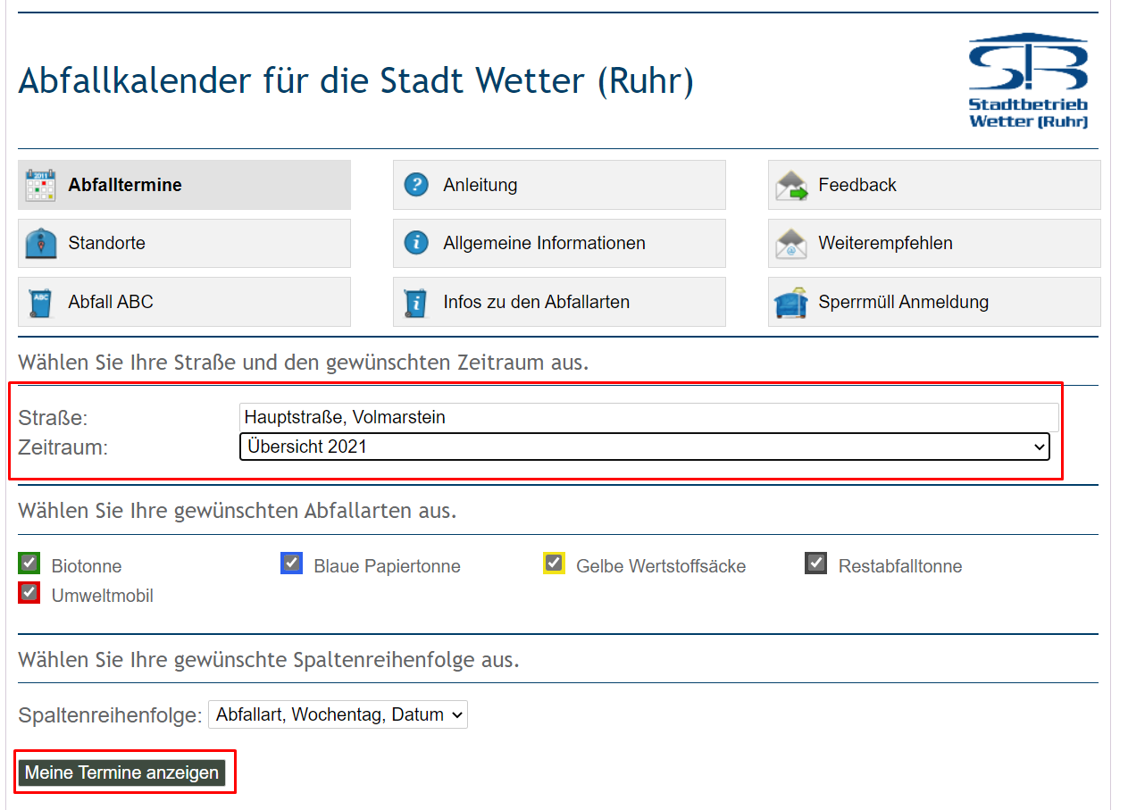 1.) Wählen Sie bei der mein-abfallkalender Seite Ihrer Stadt Ihre Straße und den gewünschten Zeitraum aus und klicken sie dann auf "Meine Termine anzeigen".