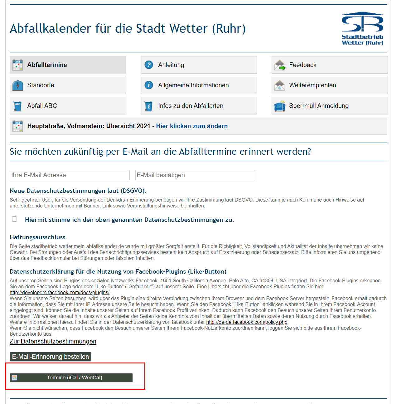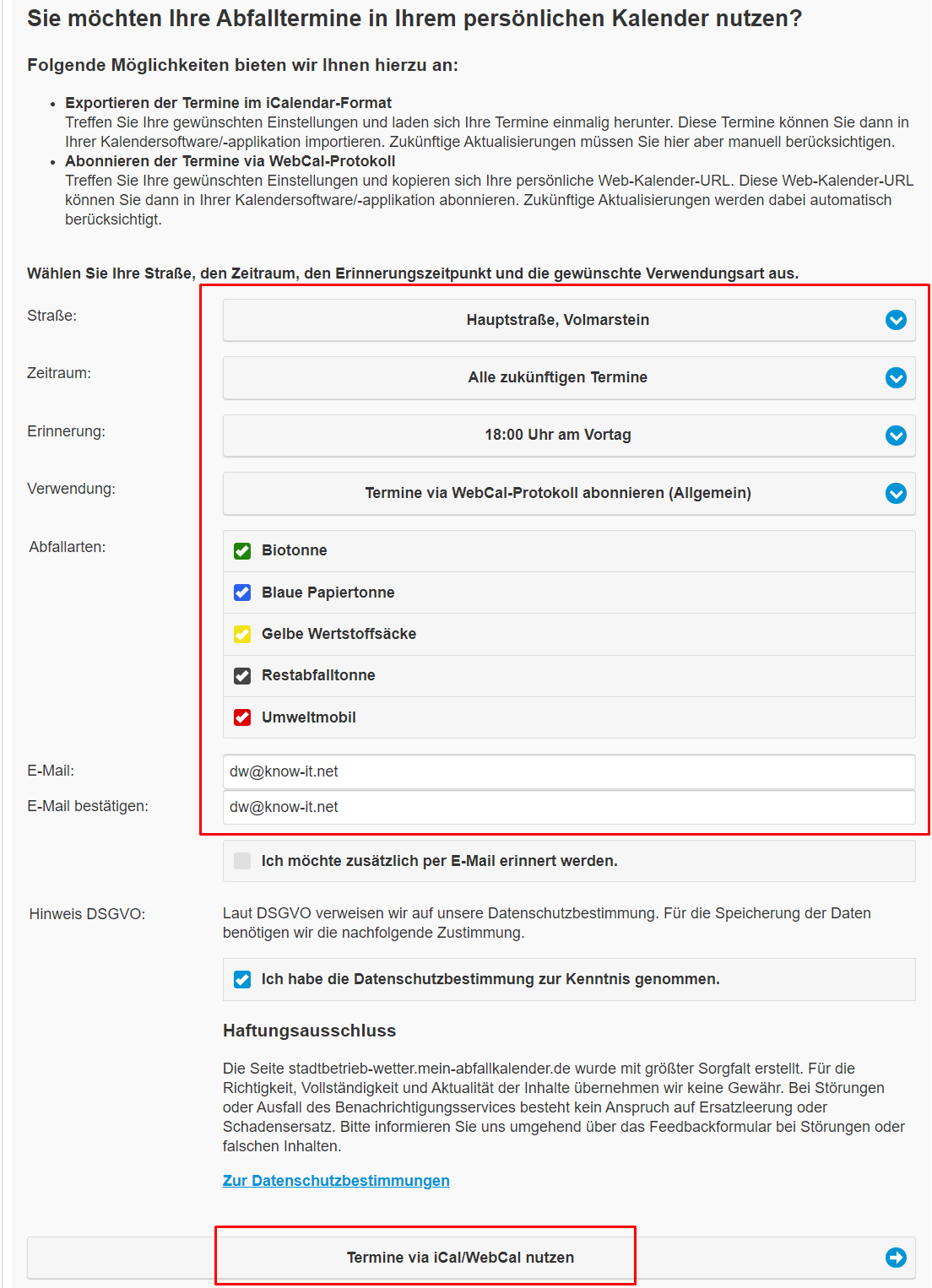 Geben Sie Ihre Email Adresse ein und setzen Sie ein Häkchen bei "Ich habe die Datenschutzbestimmungen zur Kenntnis genommen" und klicken Sie auf "Termine via ical/WebCal nutzen"